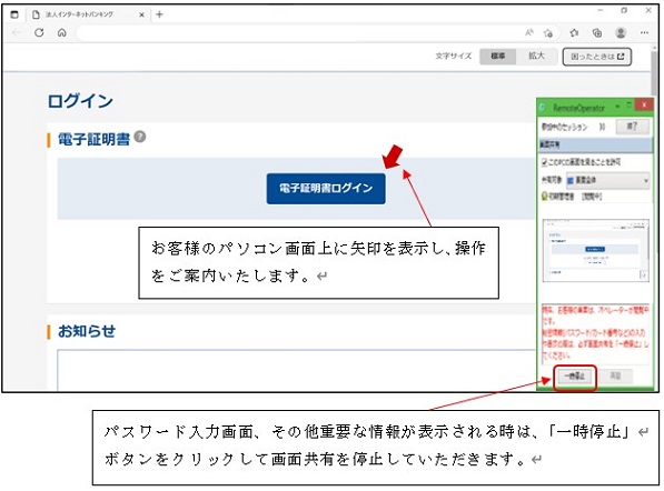 本サービスの機能は、お客様としんきんEBサポートデスクでパソコン画面を共有し、矢印表示により操作をご案内するものです。