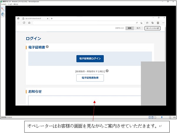 本サービスは、お客様が参照されているパソコンの画面上への矢印表示を使用したビジュアルなご案内も可能なサポートツールとなっています。