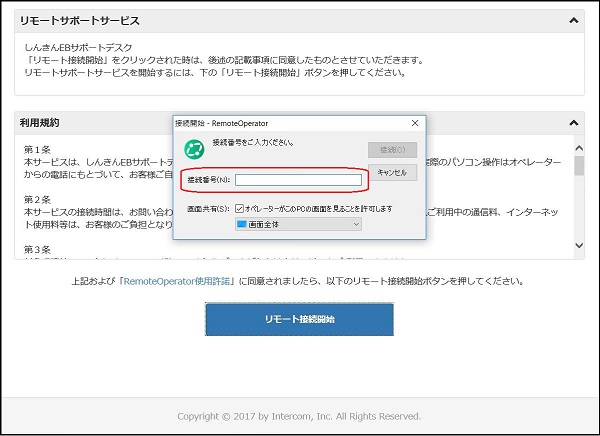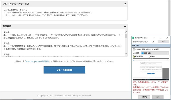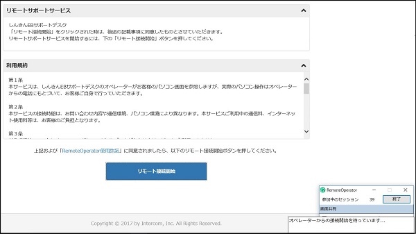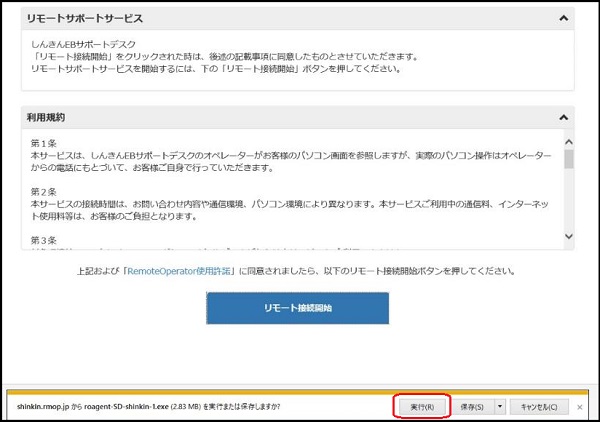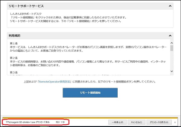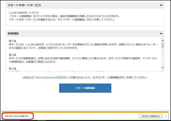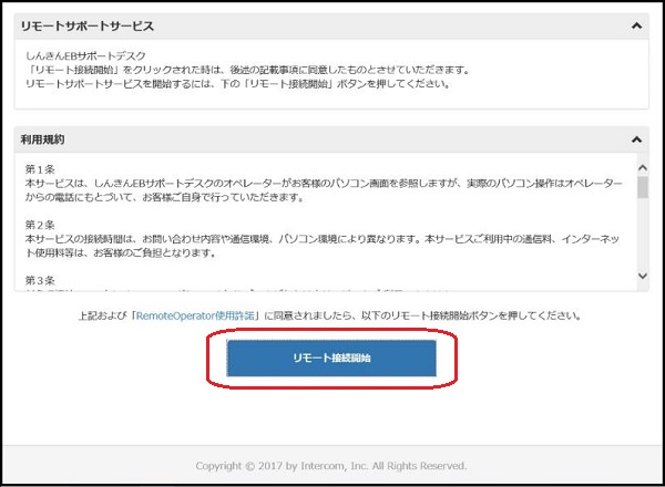 ①インターネットを開き、利用規約ページから「リモート接続開始」ボタンをクリックします